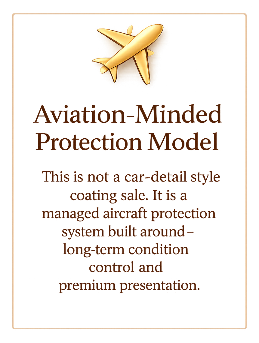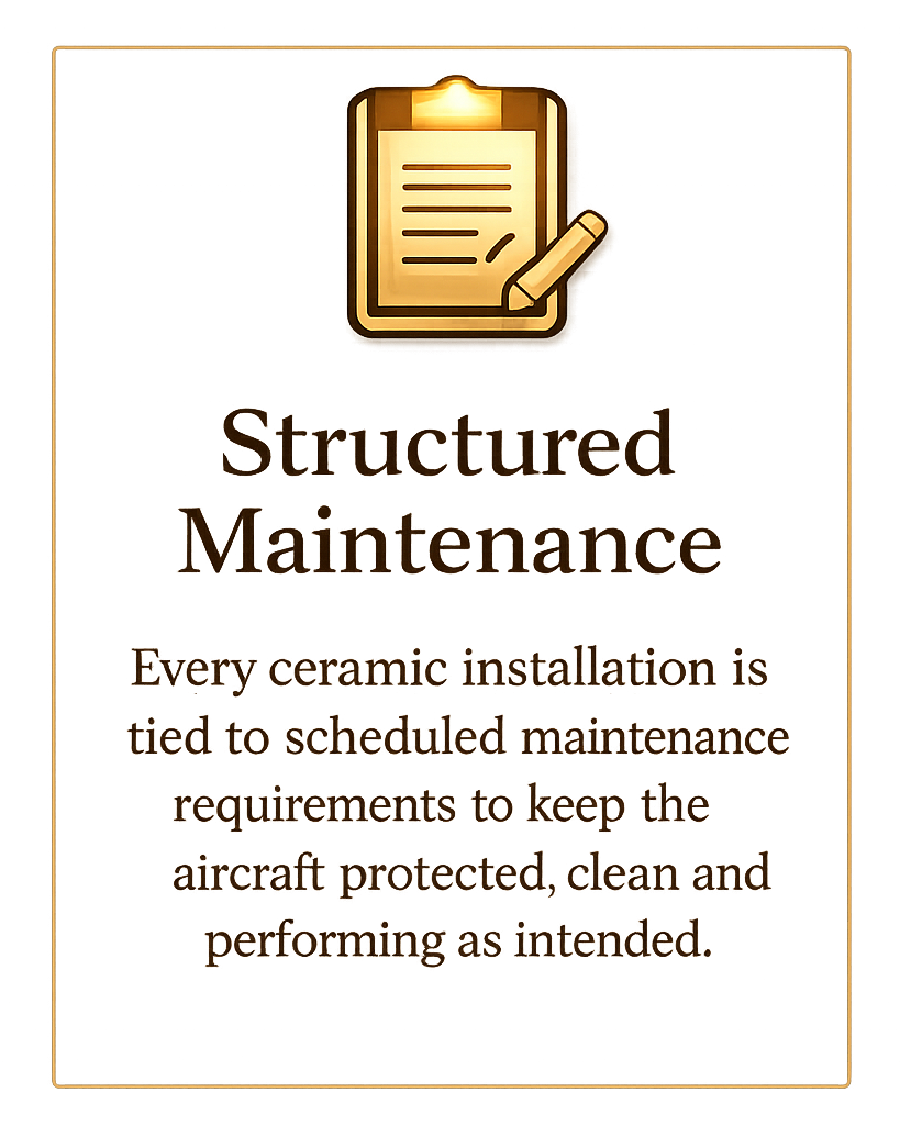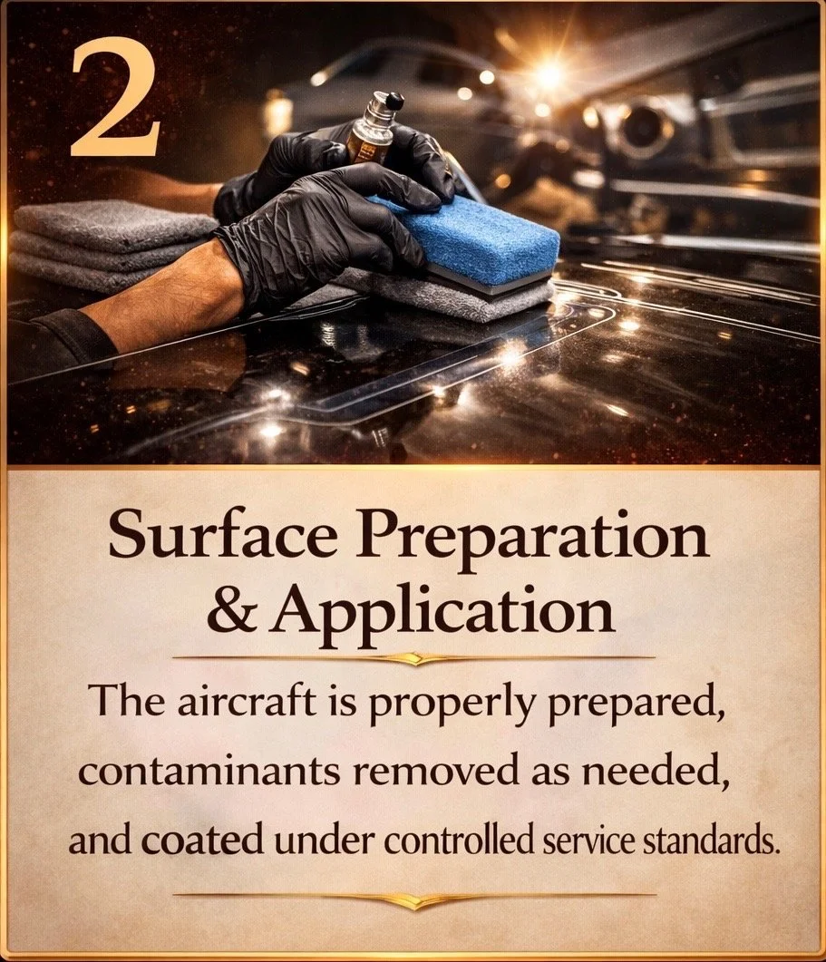JetReady’s ceramic coating service is structured as a protection program, not a one-time application. Each coating is paired with required maintenance, documentation, and care standards designed to preserve finish quality, protect coating integrity, and maintain long-term performance on privately operated aircraft.