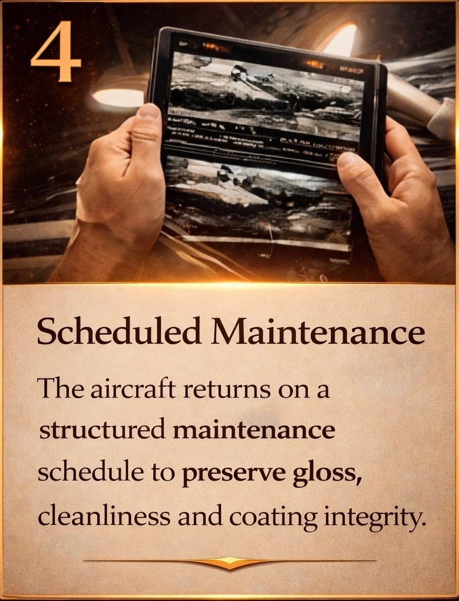 To protect both the aircraft and the client, JetReady ceramic coatings are supported by maintenance requirements, documentation standards, and application-integrity-only warranty terms. Missed maintenance, repainted surfaces, or non-compliant care can affect program standing and warranty eligibility.